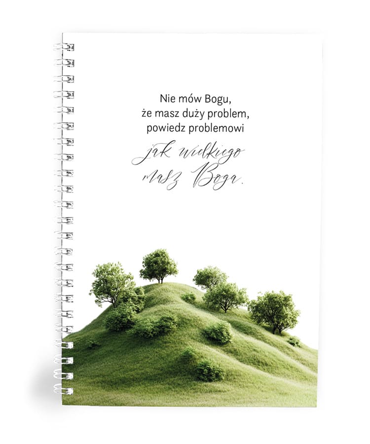 Potrzebujesz codziennego przypomnienia, że Bóg jest większy niż Twoje problemy? Mój dziennik „Jak wielkiego masz Boga” został stworzony, by dodawać odwagi i wiary w każdym momencie. Minimalistyczna okładka z zielonym wzgórzem tworzy przestrzeń spokoju, a znajdujący się na niej cytat zachęca, by patrzeć na swoje życie oczami wiary, a nie lęku.