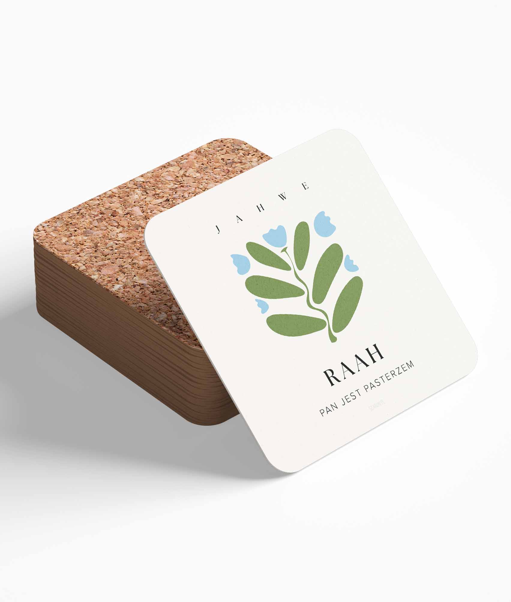 Imię Raah, oznaczające „Pan jest Pasterzem”, to głęboka deklaracja Bożej opieki, prowadzenia i troski. Podkładkę zdobi prosta, minimalistyczna ilustracja roślinna w odcieniach zieleni i błękitu.